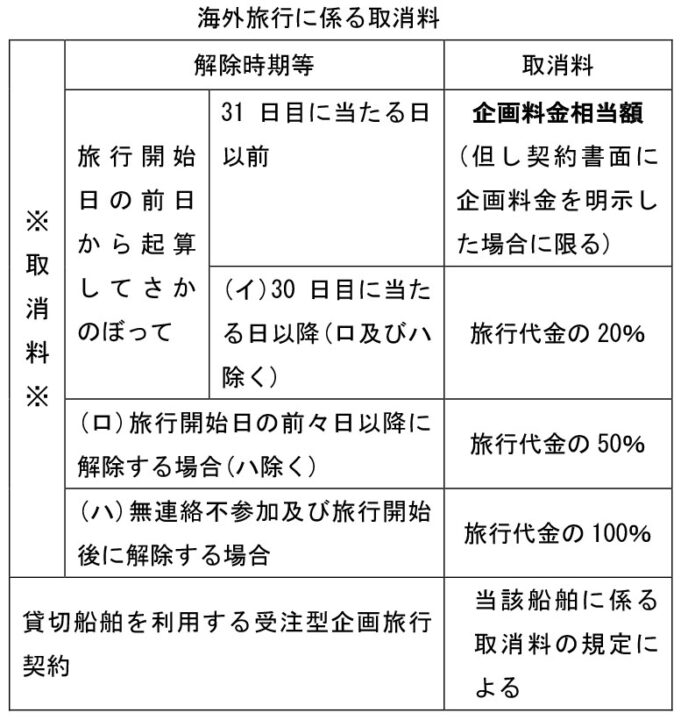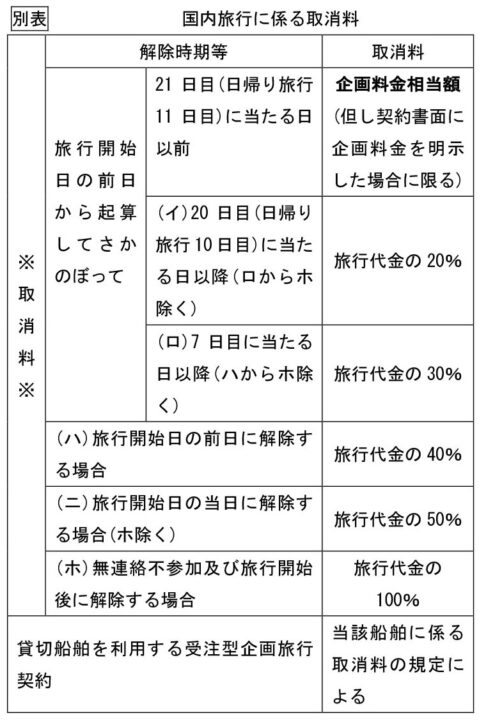 ①お客様は、企画書面記載の企画料金又は取消料を支払って受注型企画旅行契約を解除することができます。尚、取消料については別途お渡しする契約書面(お見積書等)に特に明示が無い場合には本条件書の別表の通りお支払いただきます。