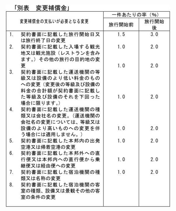 a.旅行開始日又は終了日の変更 b.入場する観光地、観光施設、その他の旅行の目的地の変更 c.運送機関の種類又は会社名の変更 d.運送機関の「設備及び等級」のより低いものへの変更 e.本邦内の旅行開始地たる空港又は旅行終了地たる空港の異なる便への変更 f.本邦内と本邦外との間における直行便の乗継便又は経由便への変更 g.宿泊機関の種類又は名称の変更 h.宿泊機関の客室種類、設備、景観その他の客室の条件の変更