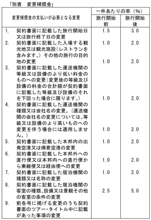 当社は、当社約款の規定により「別表 変更補償金」に掲げる契約内容の重要な変更(天災地変、戦乱、暴動、官公署の命令、運送・宿泊機関等のサービス提供の中止、当初の運送計画によらない運送サービスの提供、旅行参加者の生命または身体の安全確保のために必要な措置等による変更を除きます)が生じた場合は旅行代金に1%~5%の所定の率を乗じて得た額の変更補償金を旅行終了日の翌日から起算して30日以内にお客様に支払いますが、当社の旅行者1名に対して1旅行契約につき支払う変更補償金の額は15%を上限とします。尚、旅行者1名に対して1旅行契約につき支払うべき変更補償金の額が1000円未満であるときは変更補償金を支払いません。